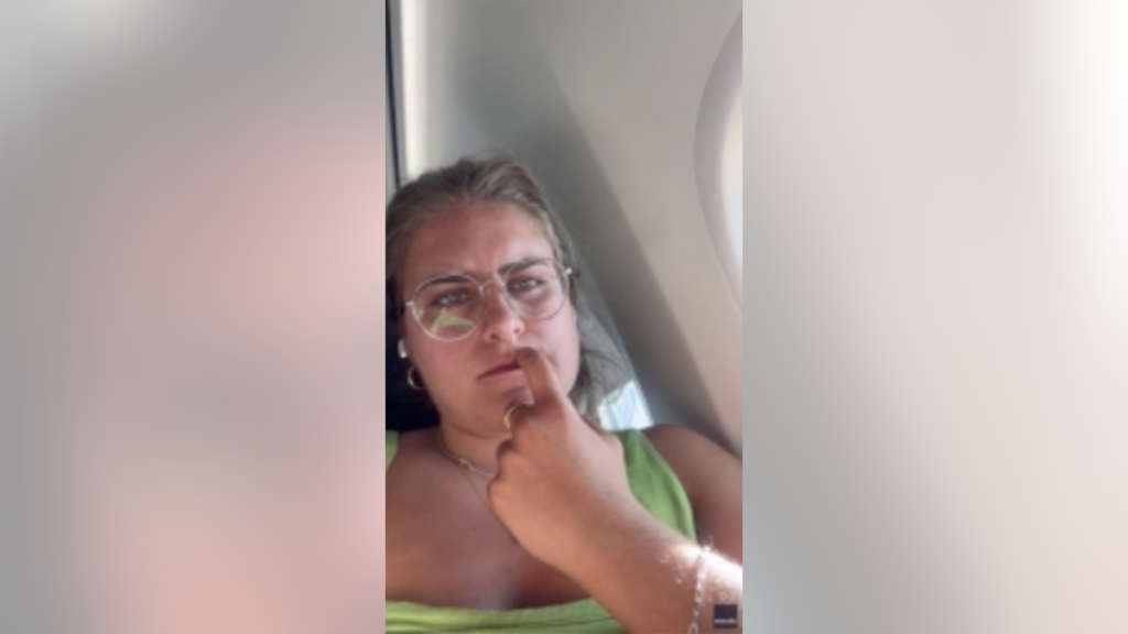 Fanny Gagnon O’Donnell (pictured here) was on a flight from Spain to Germany when the person next to her in the middle seat continued to cross into her seat. (Fanny Gagnon O’Donnell/Storyful)